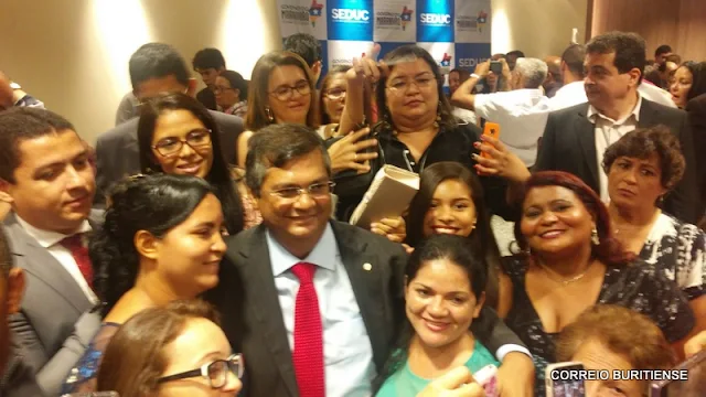 No final da cerimônia de posse, o governador Flávio Dino atendeu ao pedido dos gestores para tirar fotos com os presentes.